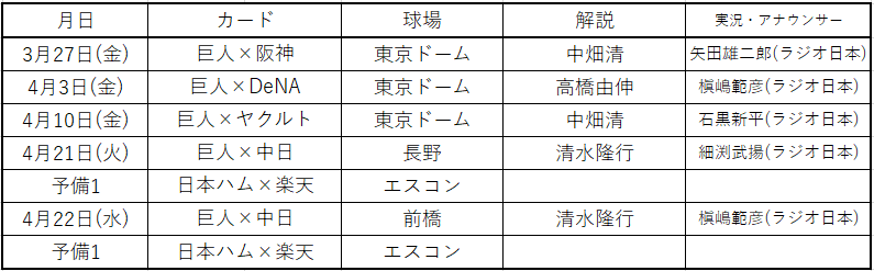 昨年惜しくもリーグVを逃した巨人は、今季阿部慎之助監督のもと、リーグV奪回を目指し2026年シーズンのスタートを切ります。“ラジオ日本ジャイアンツナイター”では、巨人OB会長・中畑清氏や元監督・高橋由伸氏など精鋭解説陣の「巨人愛」溢れる解説を交え迫力の実況で、巨人主催試合を中心に放送します。