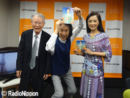 そして、写真左のこの方は長山さんのプロデューサー、堺弘邦さん。美空ひばりさんなどを手がけられた名プロデューサーで、「演歌歌手 長山洋子」を作り上げた方なのです!今日はスタジオに遊びに来てくださいました。貴重なスリーショット!
